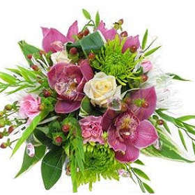 Vegyes csokor szezonális fehér virágokból, tulipánnal, fréziával, orgonával, zöld minikrizivel, viburnummal, levelekkel.